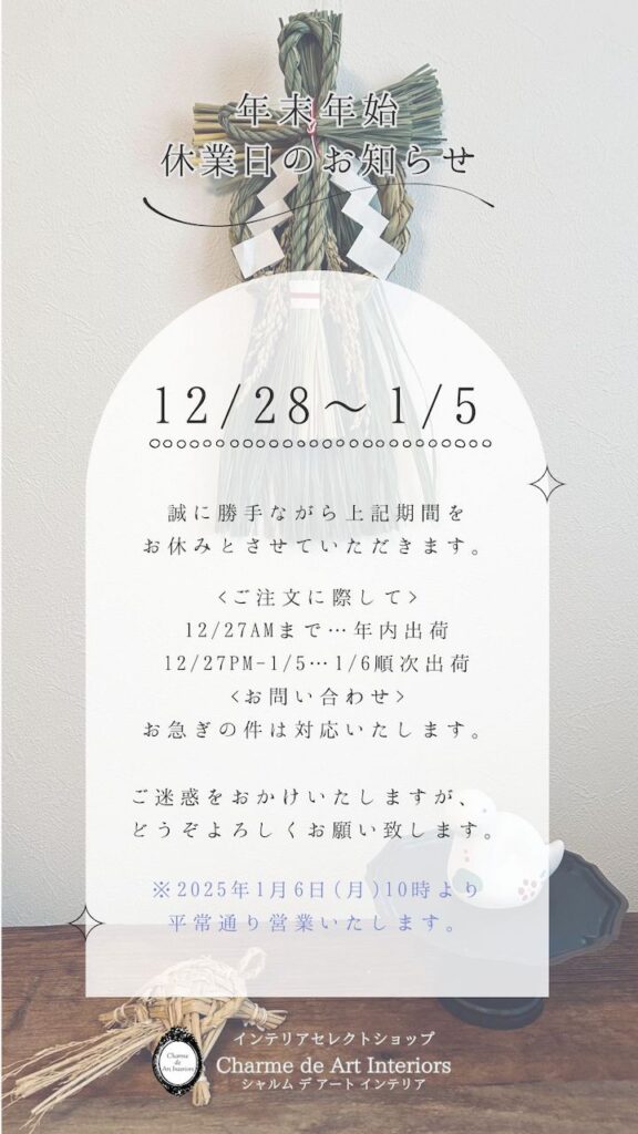 年末年始休業日のお知らせ お知らせ X Facebook はてブ Pocket LINE Pinterest LinkedIn コピー コメント 2024.12.20 こんにちは^^ いつもCharme de Art Interiors をご愛顧いただきありがとうございます。 誠に勝手ながら、12/28〜1/5の期間をお休みとさせていただきます。 ご迷惑をお掛けいたしますが、どうぞよろしくお願いいたします。 ☆.。.:*・°☆.。.:*☆.。.:*・°☆.。.:* クリスマスセール開催中 ☆.。.:*・°☆.。.:*☆.。.:*・°☆.。.:* SHOPPING >> カテゴリー一覧 アート|アートフラワー|フラワーベース |キャンドル|インテリア小物|ラッキー|ファッション